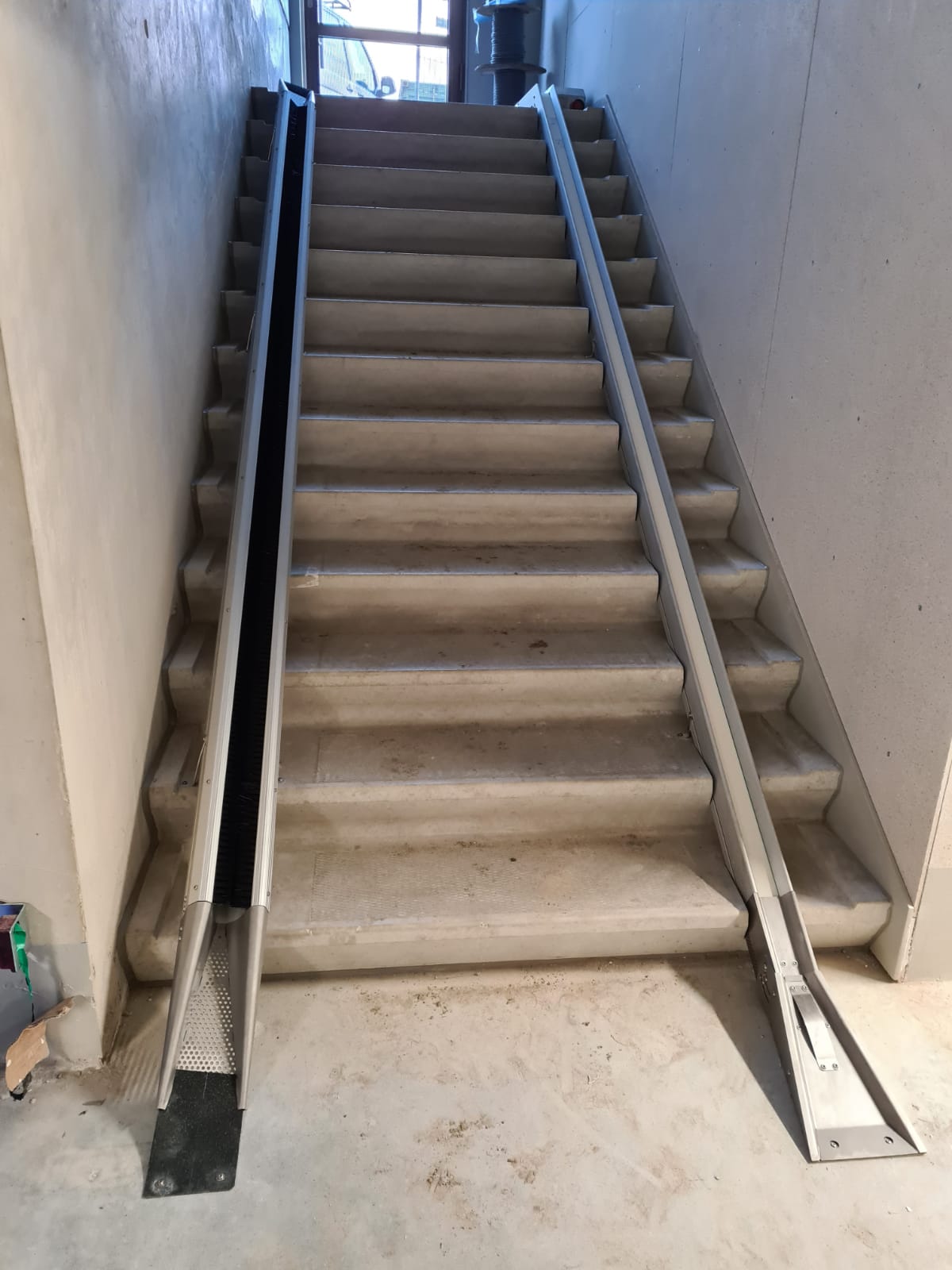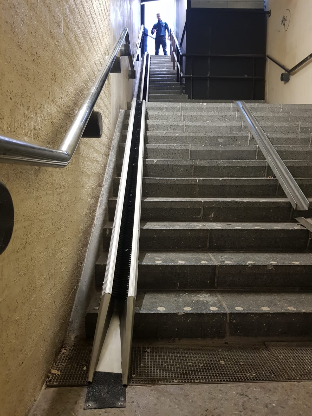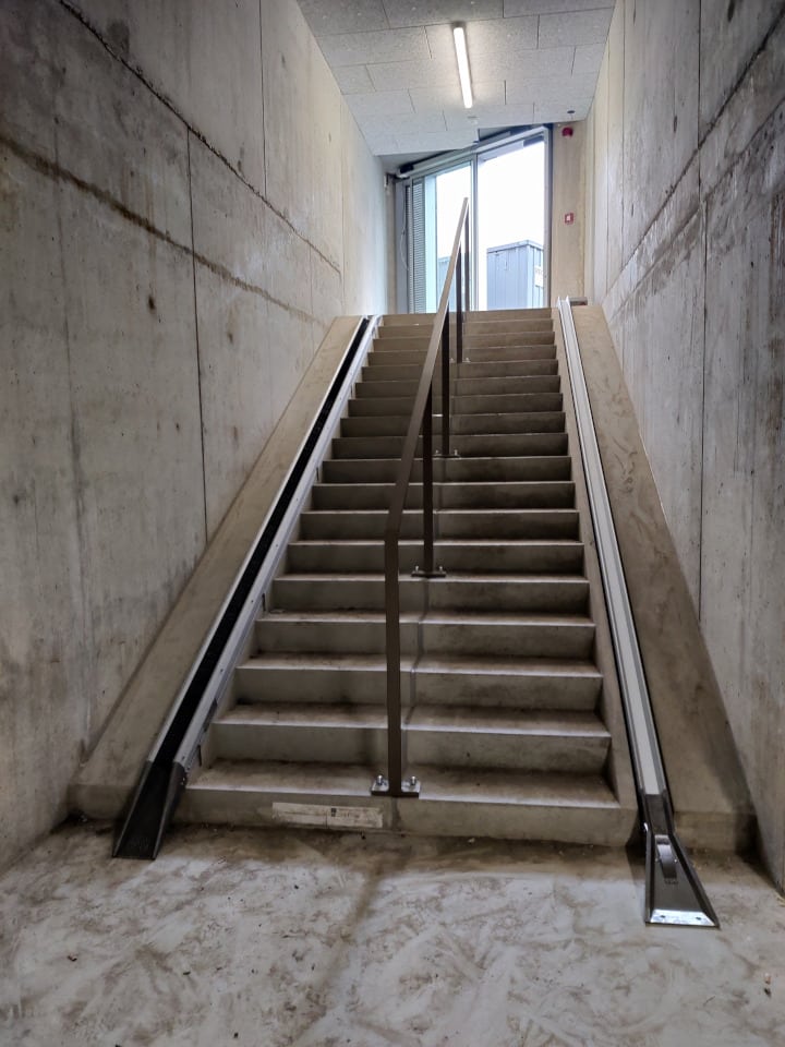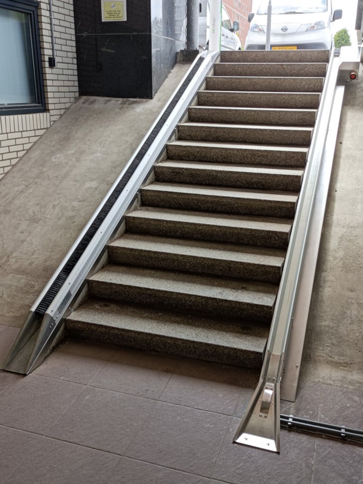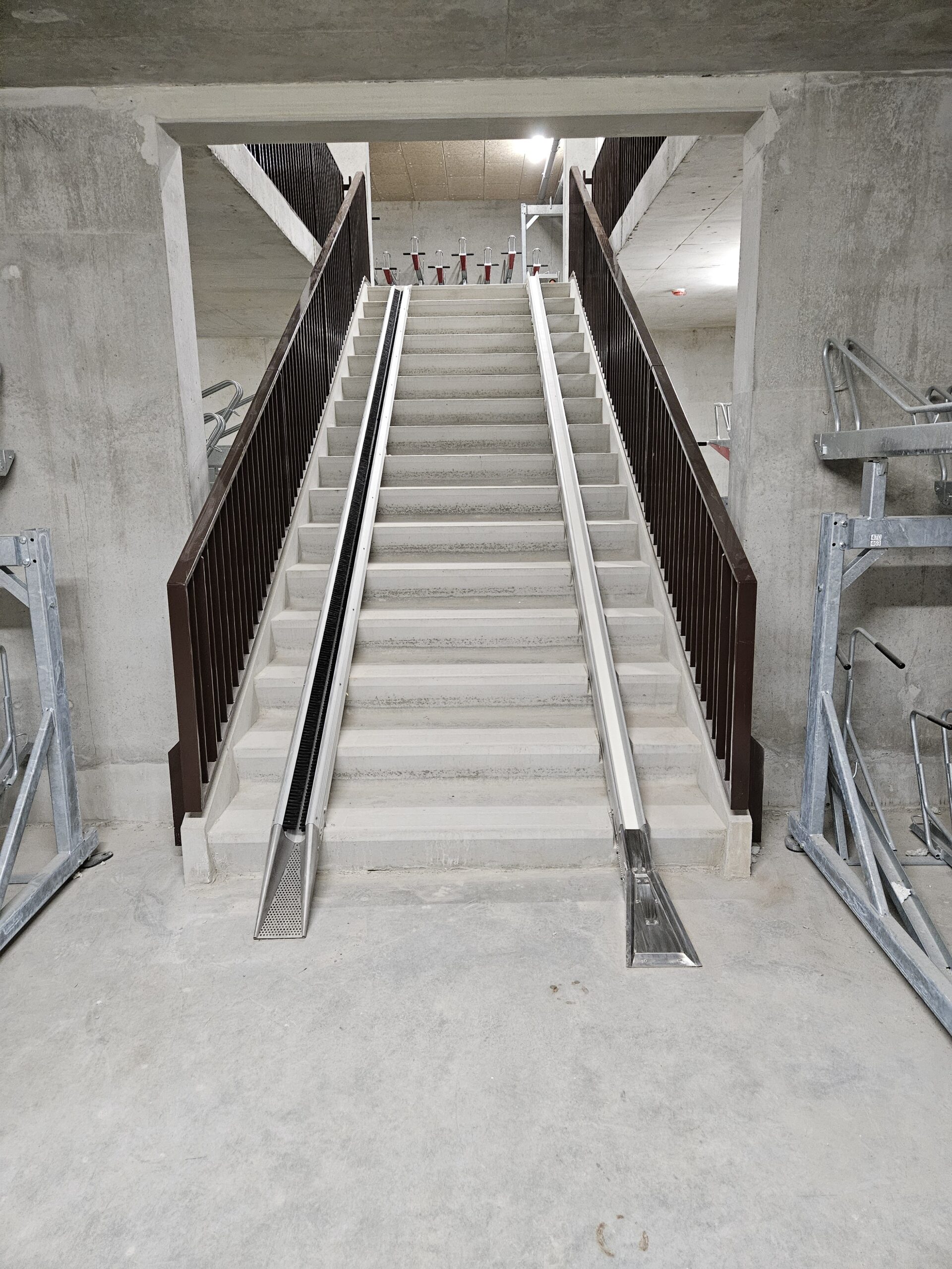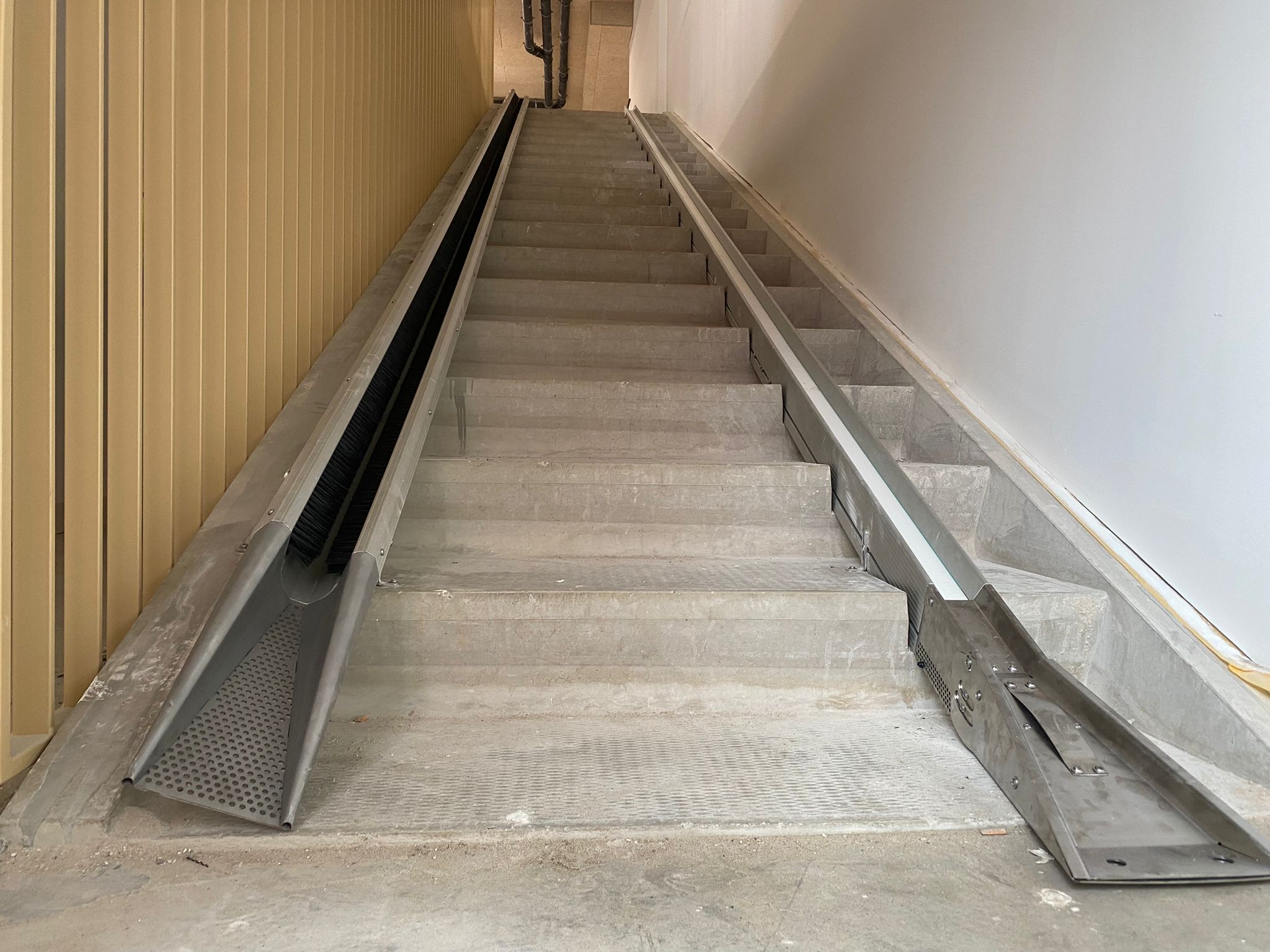 VeloComfort® is an innovative bicycle transport system that helps users guide their bicycles effortlessly and safely from top to bottom. At the top of the stairs, the right side is equipped with the VeloComfort® Gutterbrush, a specially designed bicycle gutter fitted with brushes that allow the bike to be slowed down. This enables the user to guide the bicycle downward in a controlled manner and at their own pace.