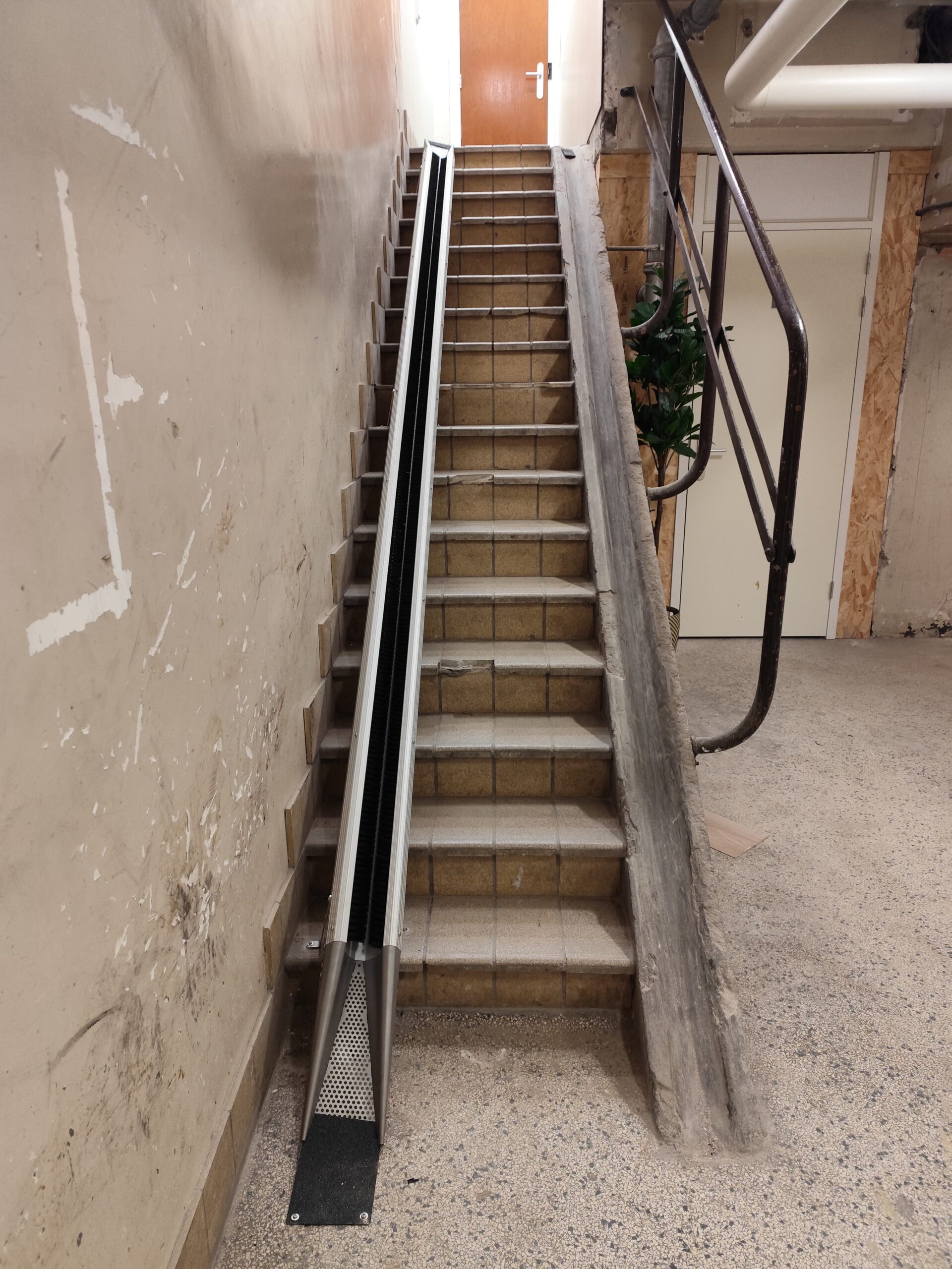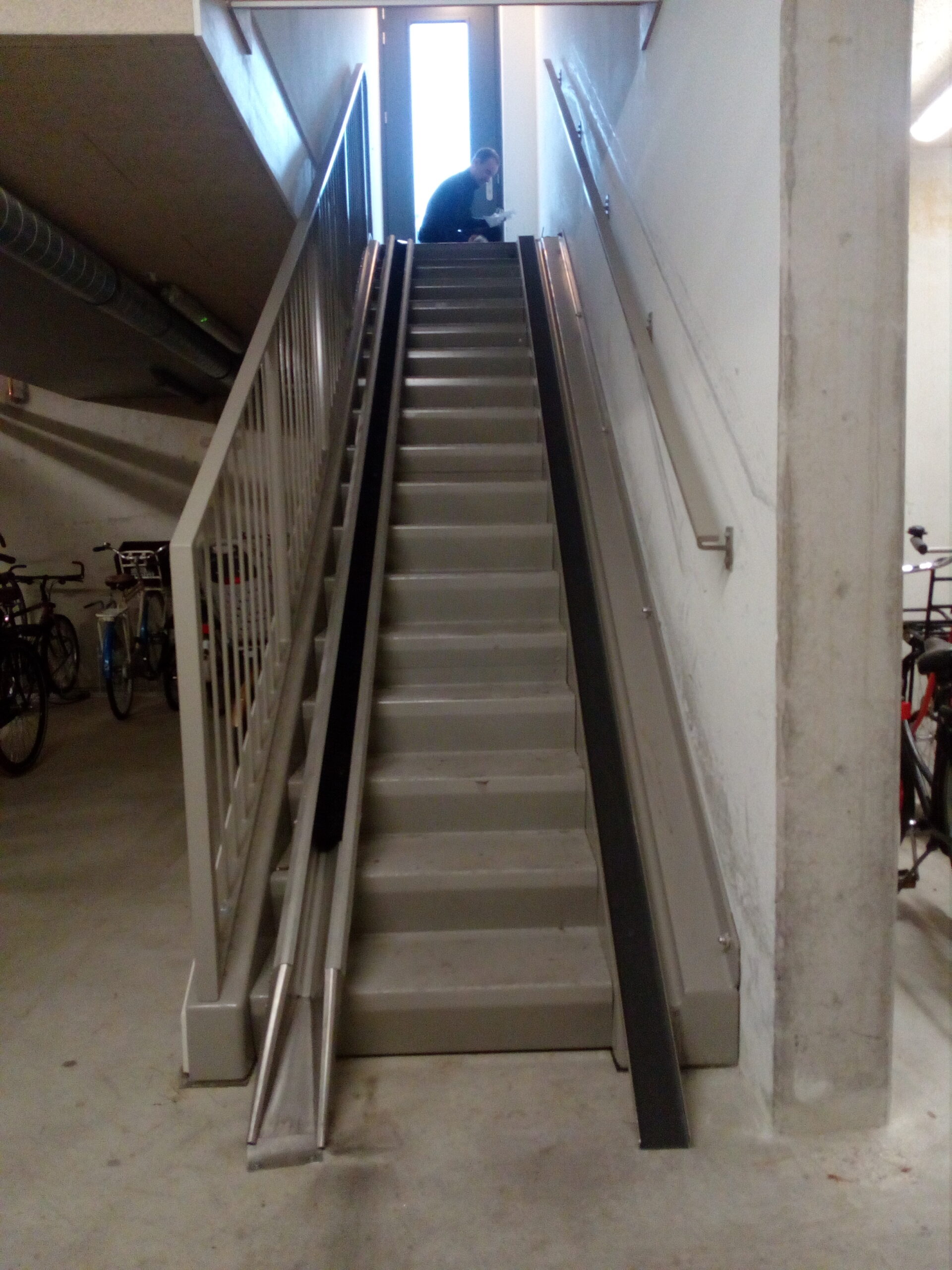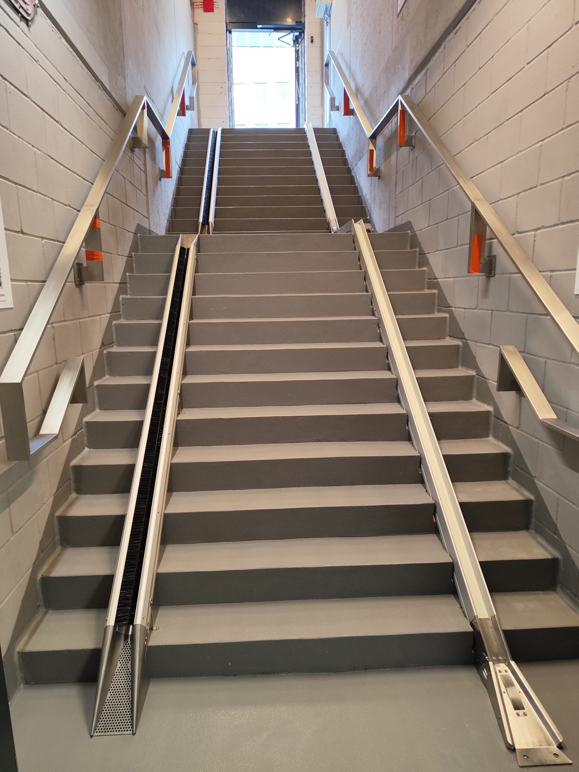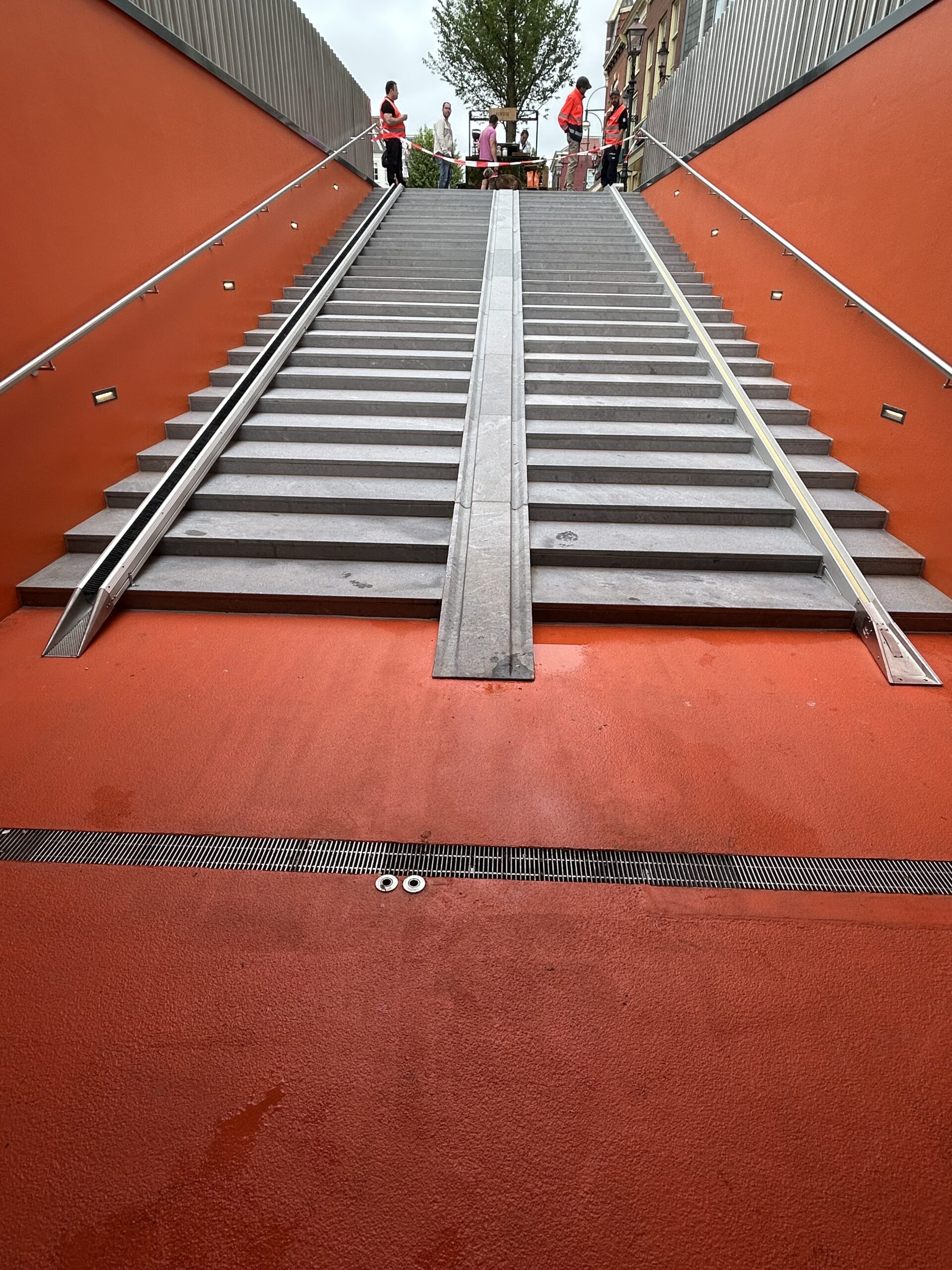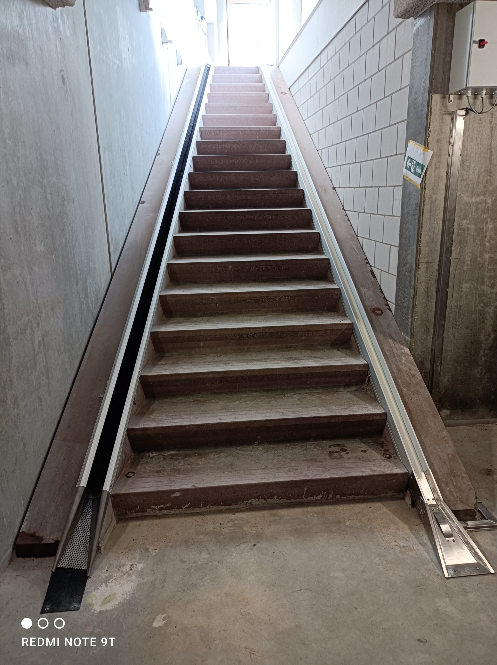 VeloComfort® is an innovative bicycle transport system that helps users guide their bicycles effortlessly and safely from top to bottom. At the top of the stairs, the right side is equipped with the VeloComfort® Gutterbrush, a specially designed bicycle gutter fitted with brushes that allow the bike to be slowed down. This enables the user to guide the bicycle downward in a controlled manner and at their own pace.