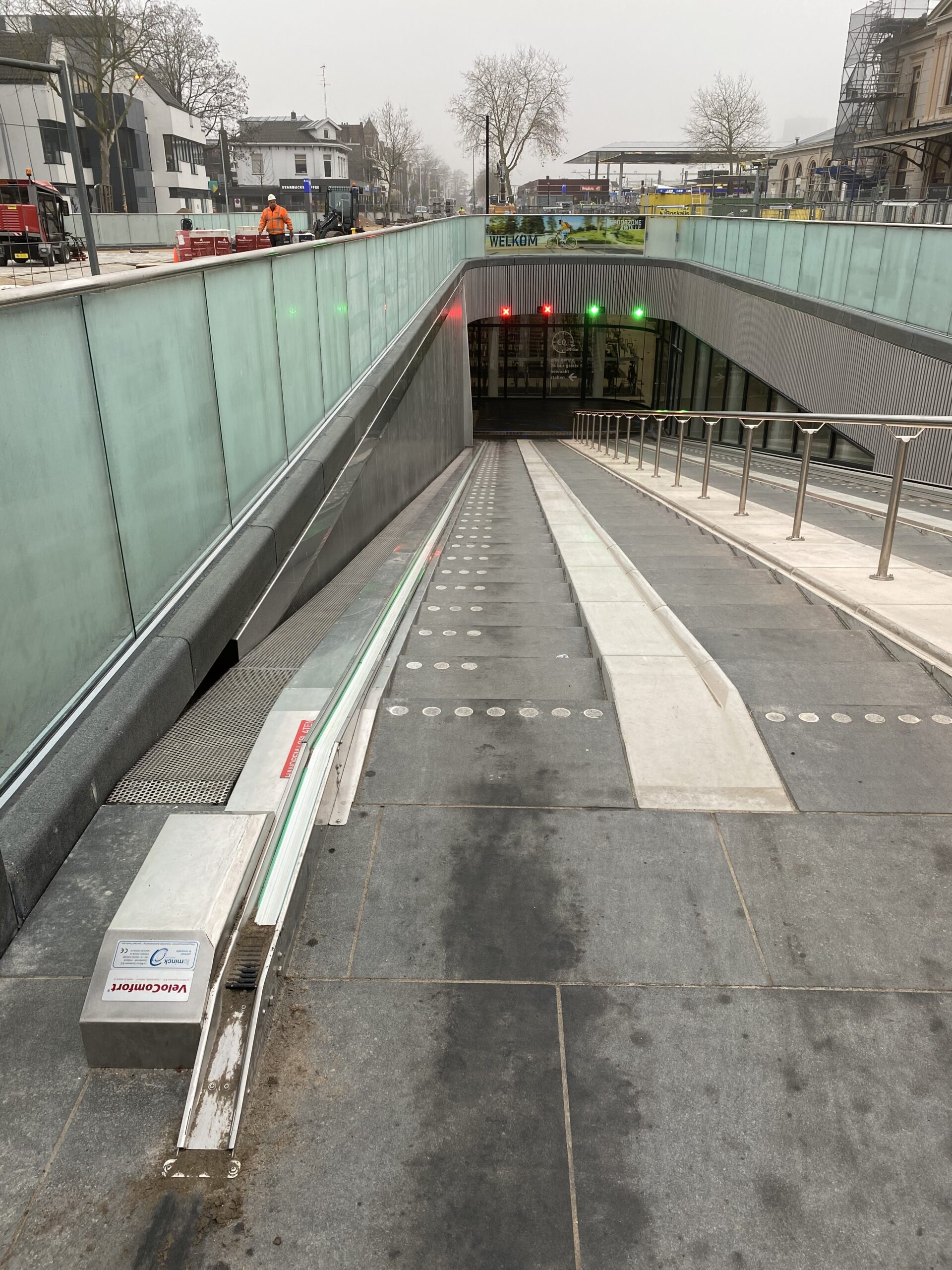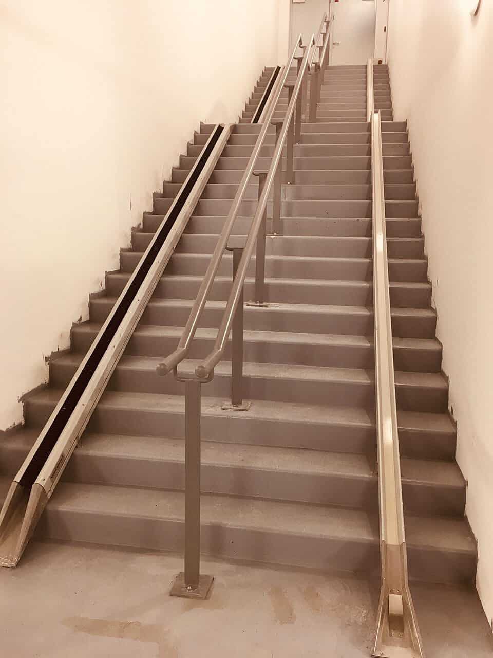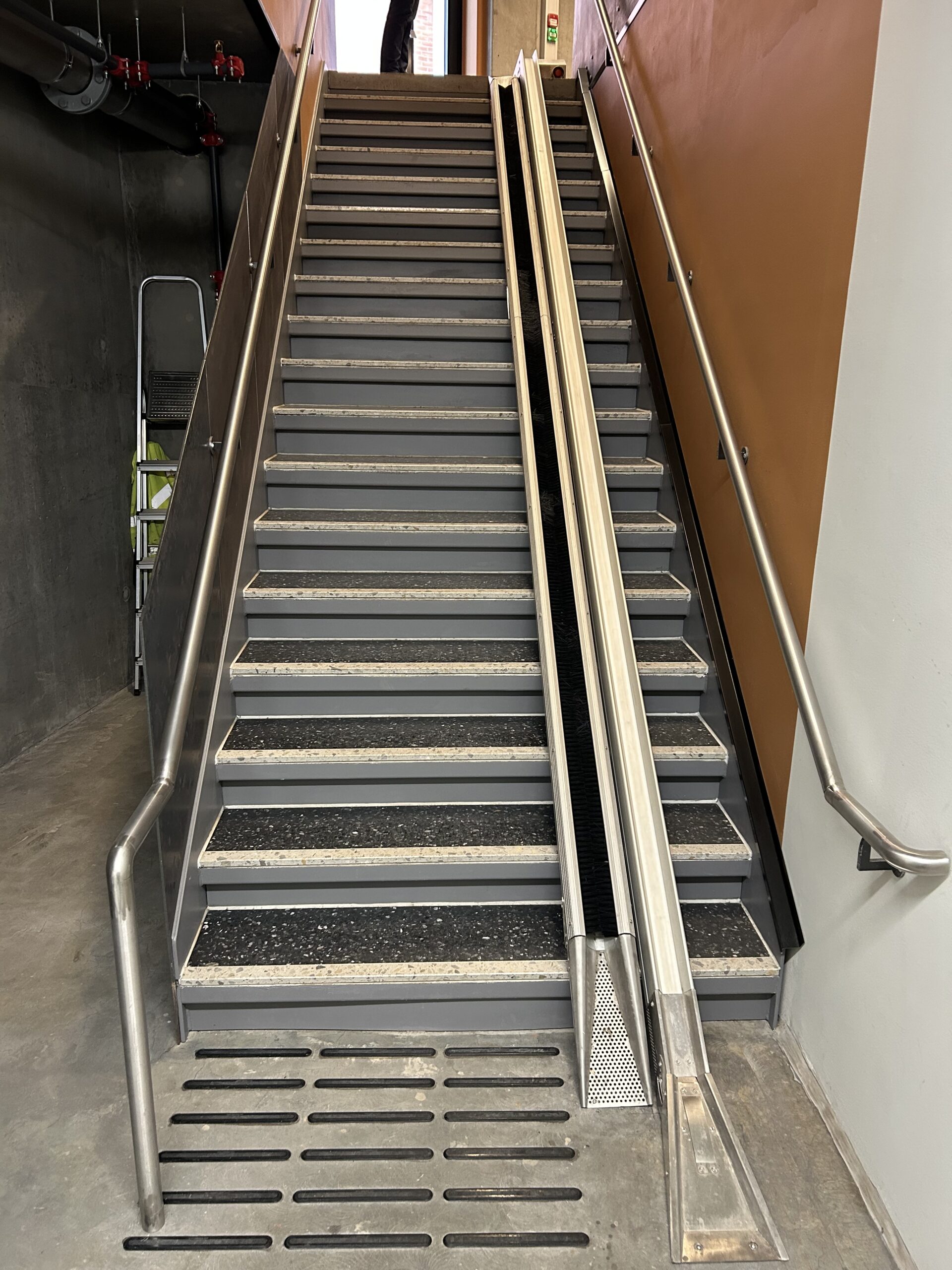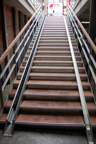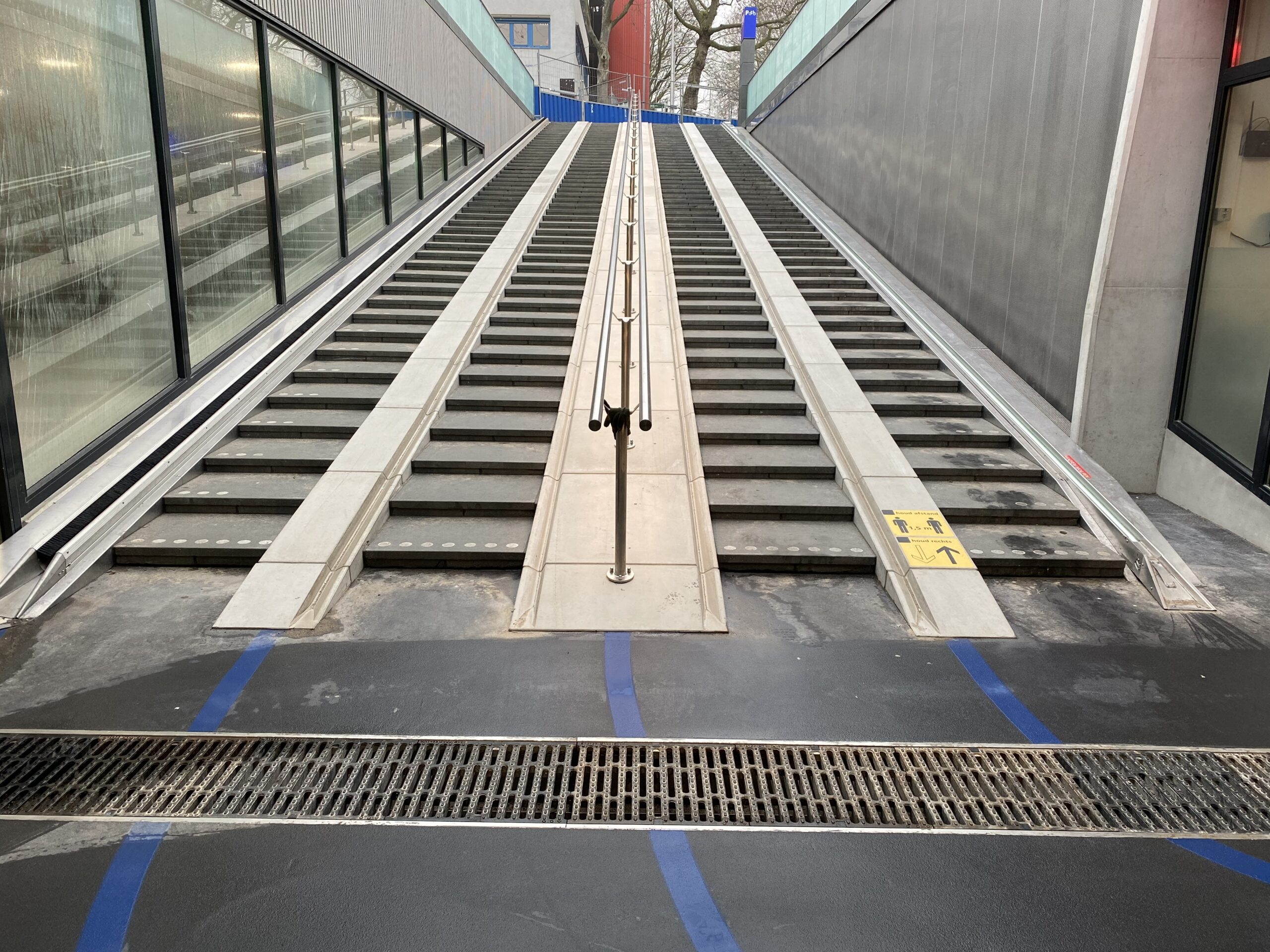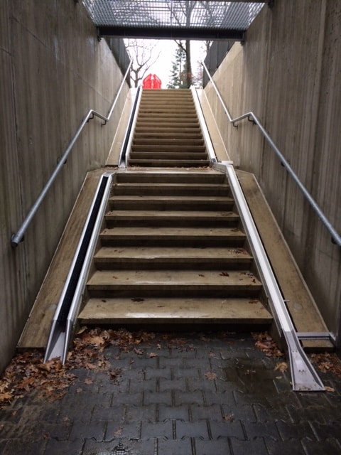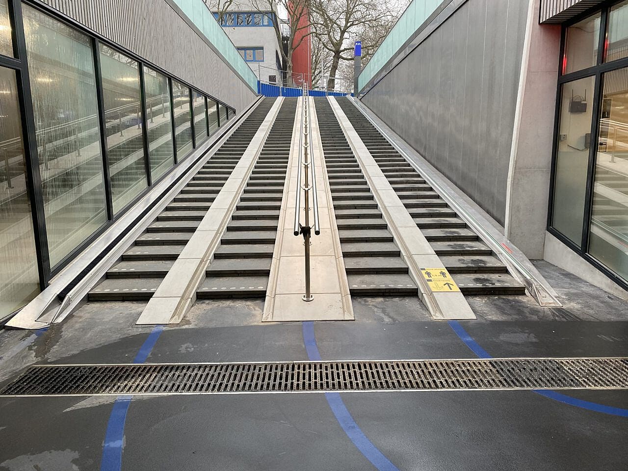 VeloComfort® is an innovative bicycle transport system that helps users guide their bicycles effortlessly and safely from top to bottom. At the top of the stairs, the right side is equipped with the VeloComfort® Gutterbrush, a specially designed bicycle gutter fitted with brushes that allow the bike to be slowed down. This enables the user to guide the bicycle downward in a controlled manner and at their own pace.