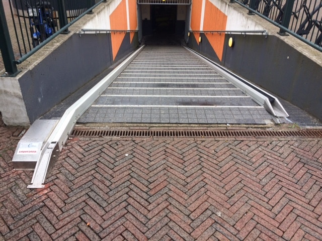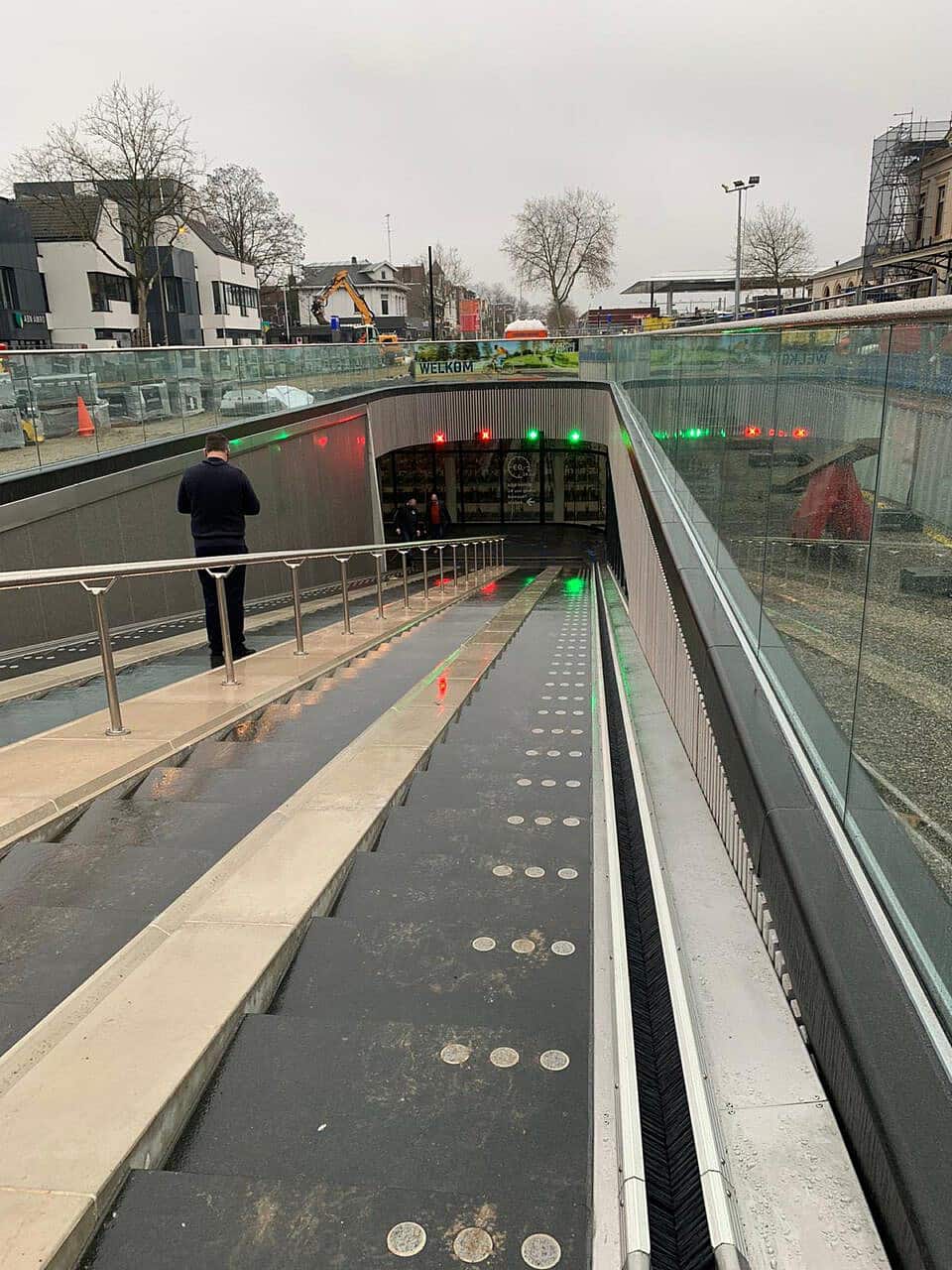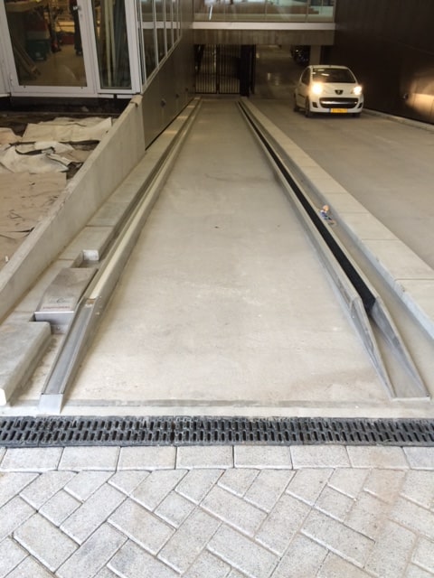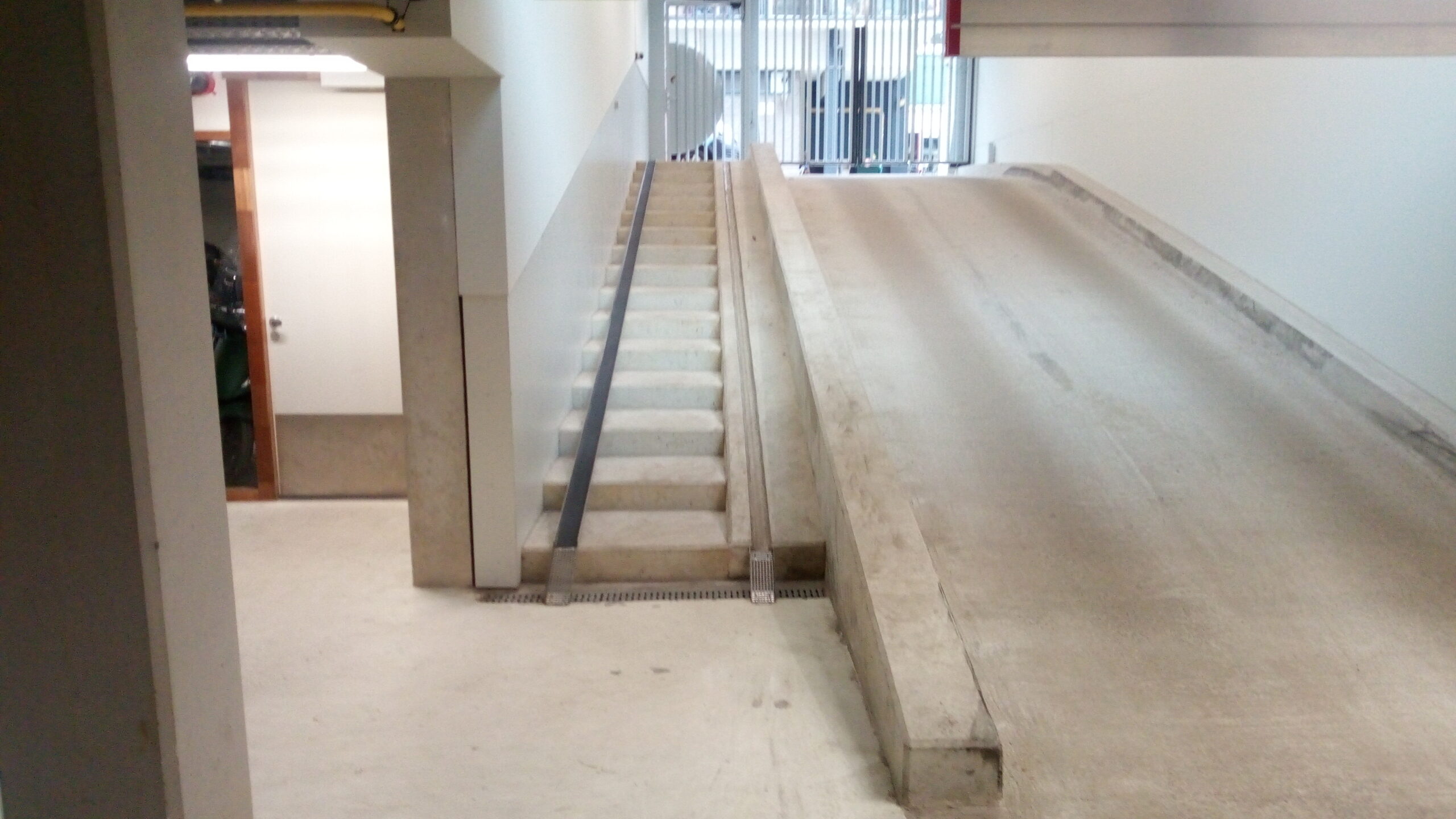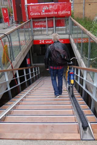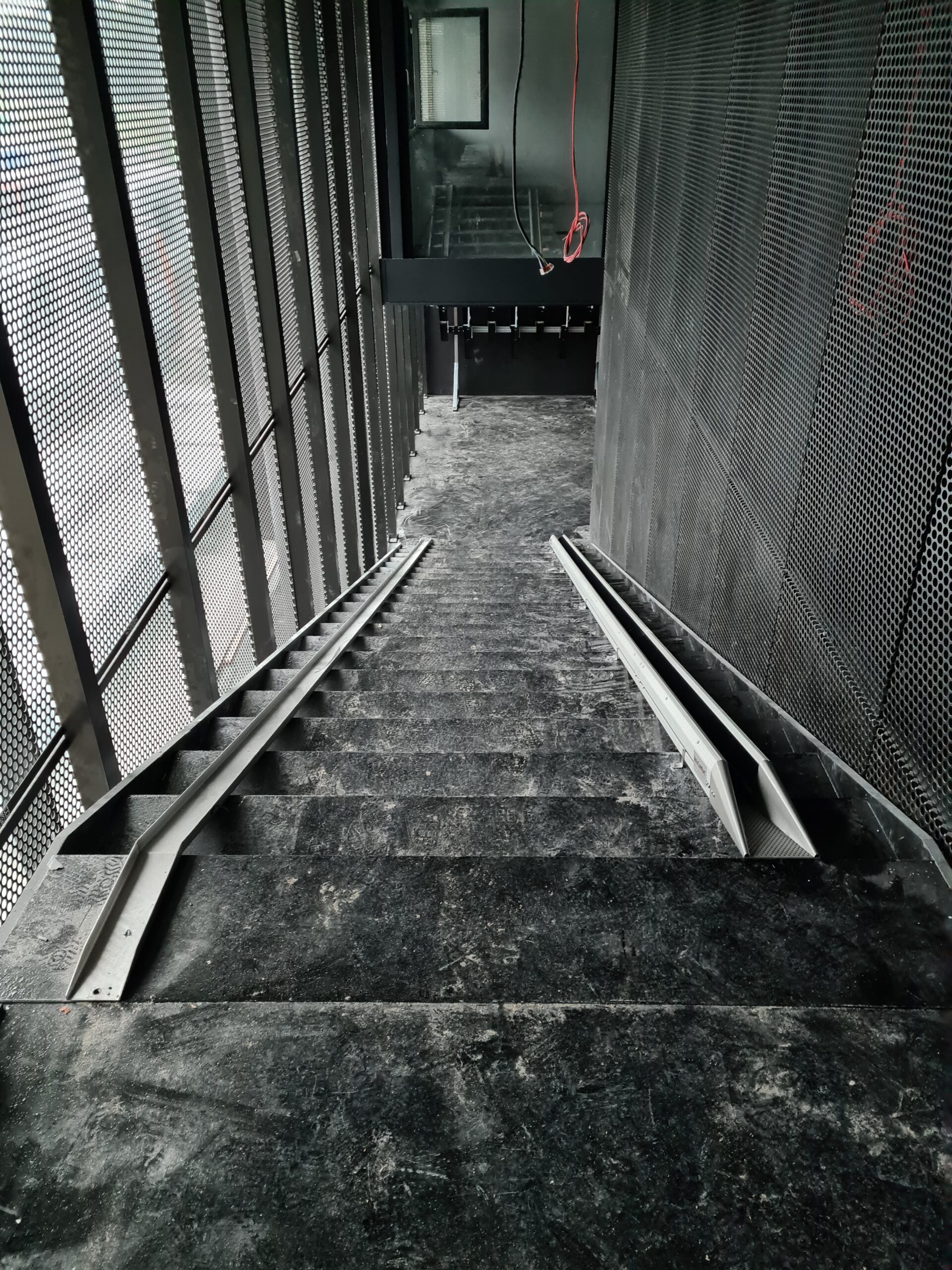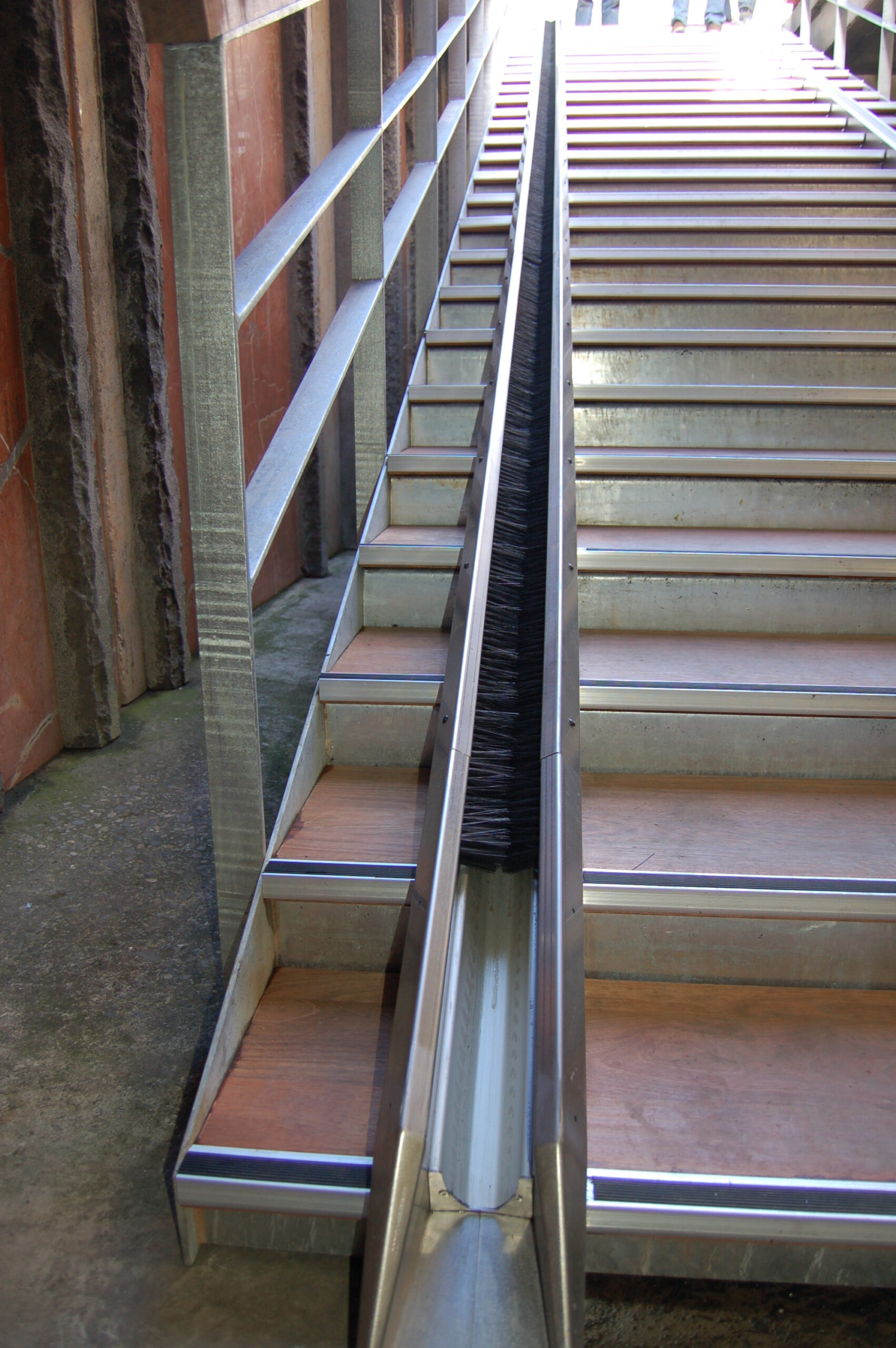 VeloComfort® is an innovative bicycle transport system that helps users guide their bicycles effortlessly and safely from top to bottom. At the top of the stairs, the right side is equipped with the VeloComfort® Gutterbrush, a specially designed bicycle gutter fitted with brushes that allow the bike to be slowed down. This enables the user to guide the bicycle downward in a controlled manner and at their own pace.