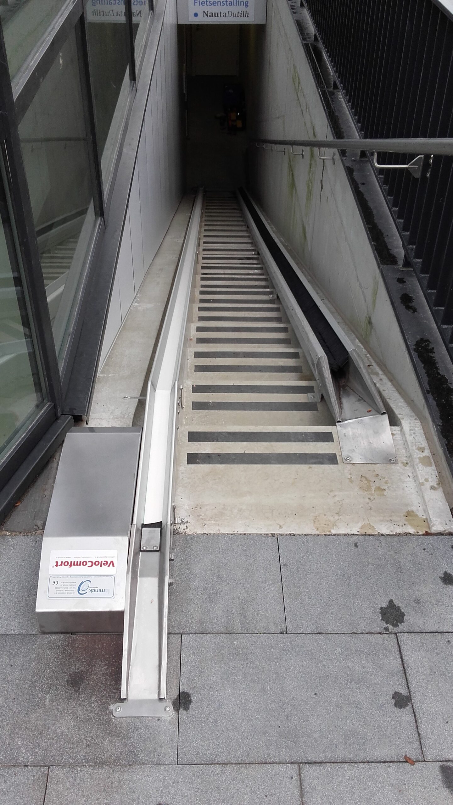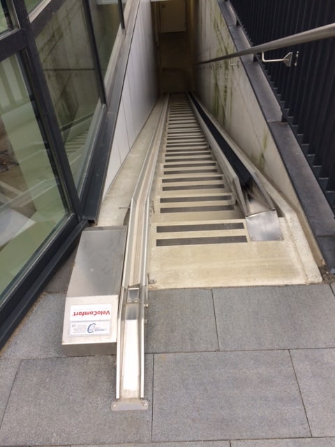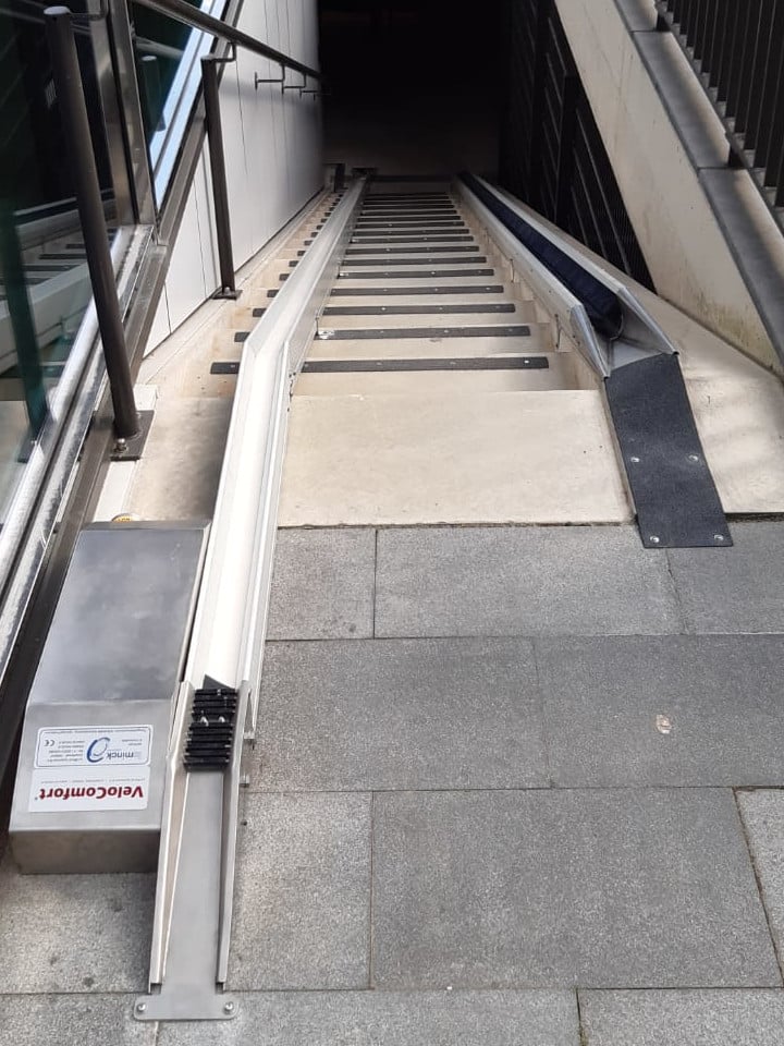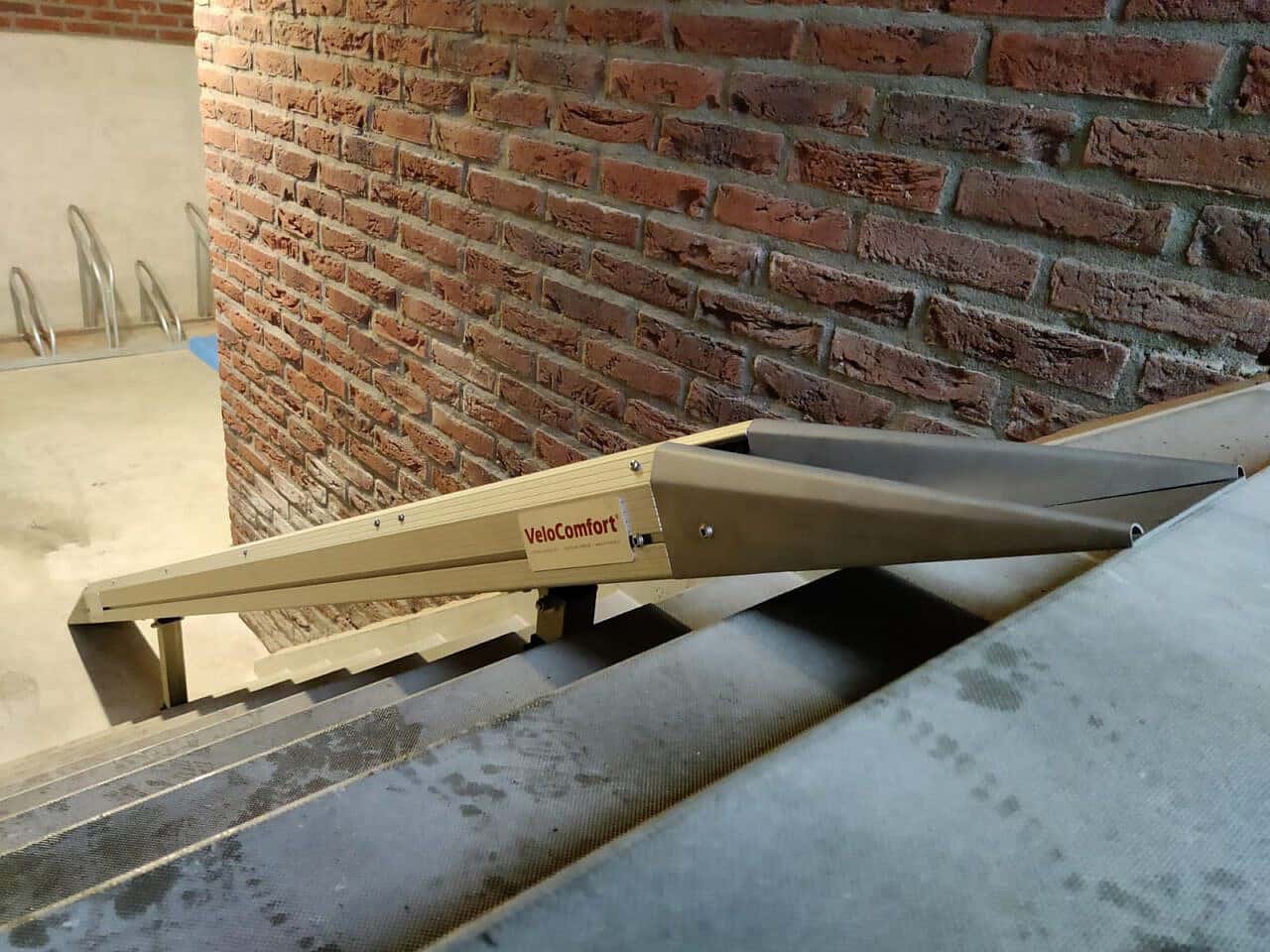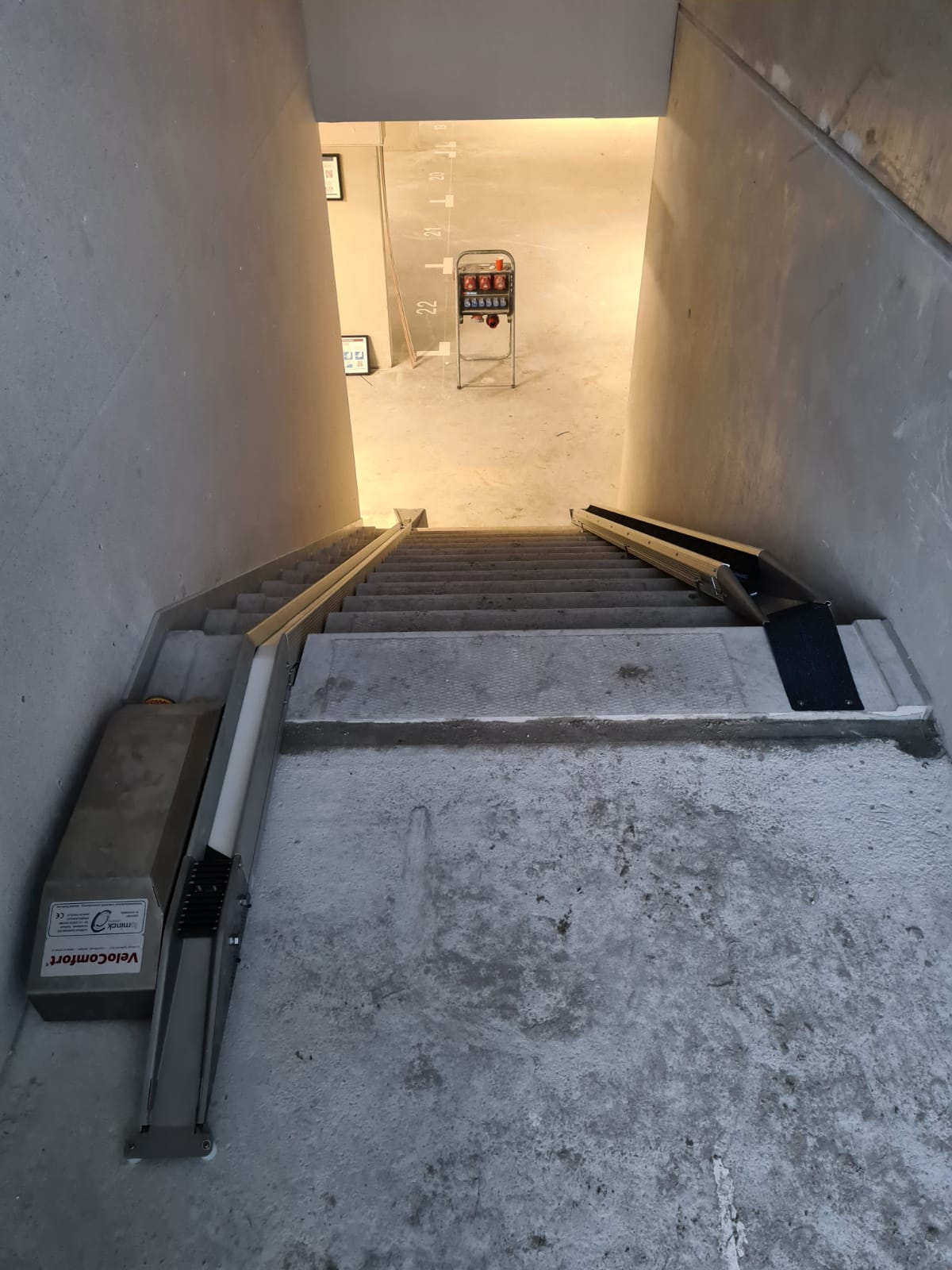 VeloComfort® system is a patented European solution for easy and safe transport of bicycles over stairs and slopes. This innovative bicycle transport system is suitable for various types of stairs, both indoors and outdoors, and offers the perfect solution for steep, narrow, wide, long, and short stairs, with or without landings, as well as a range of slopes.
