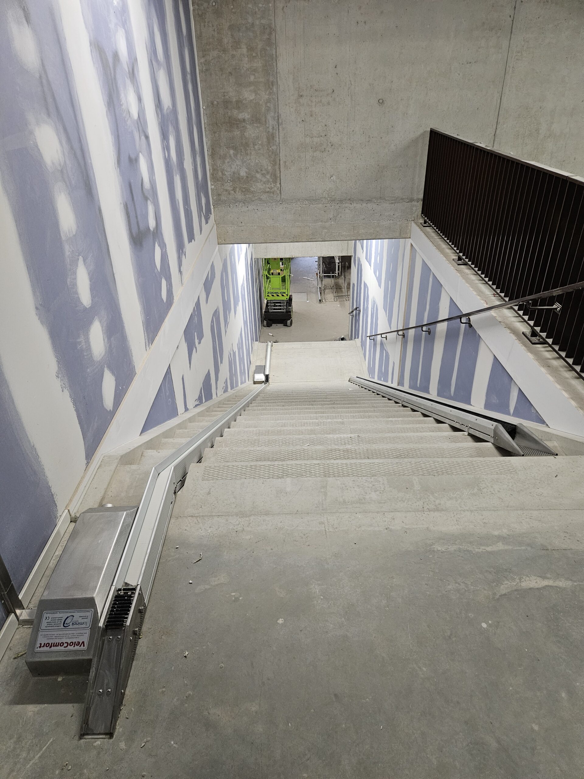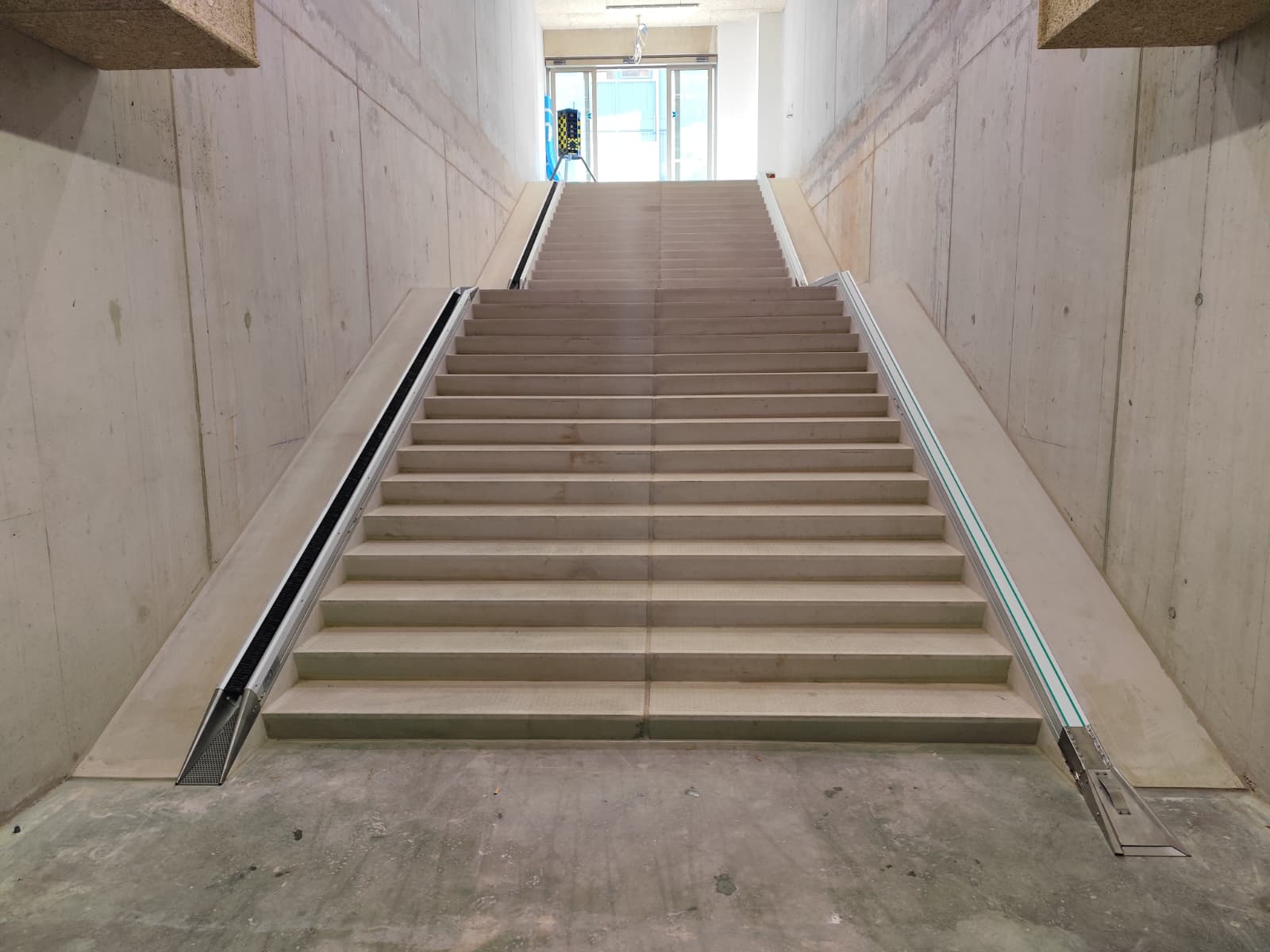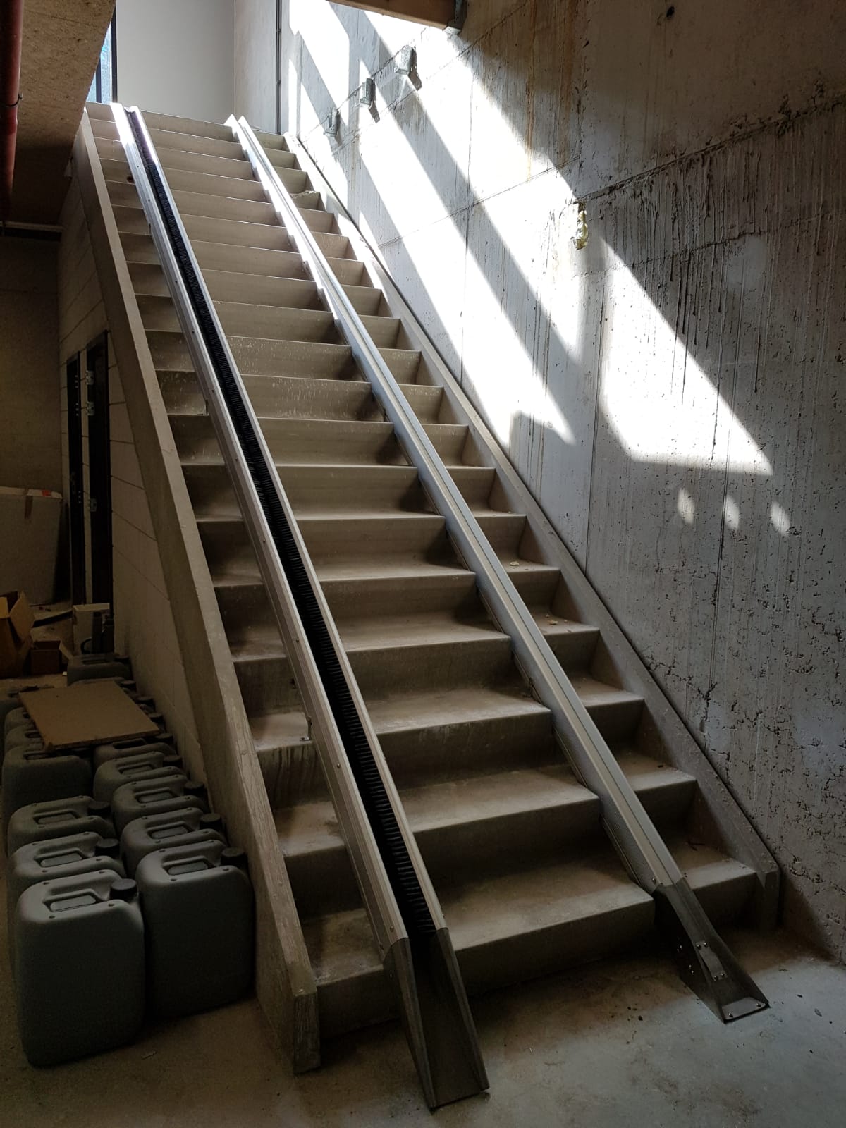 VeloComfort® is an advanced bicycle transport system, specially developed to help cyclists effortlessly move from lower to higher levels when overcoming height differences. The system uses a durable toothed belt installed on the left side of the stairs (as seen from above), allowing users to easily guide their bicycle upward on the right side. The toothed belt runs in a robust, double-walled aluminum gutter that requires little maintenance and ensures long-lasting performance. The drive is powered by a strong electric motor, ensuring smooth and efficient operation even under heavy use.